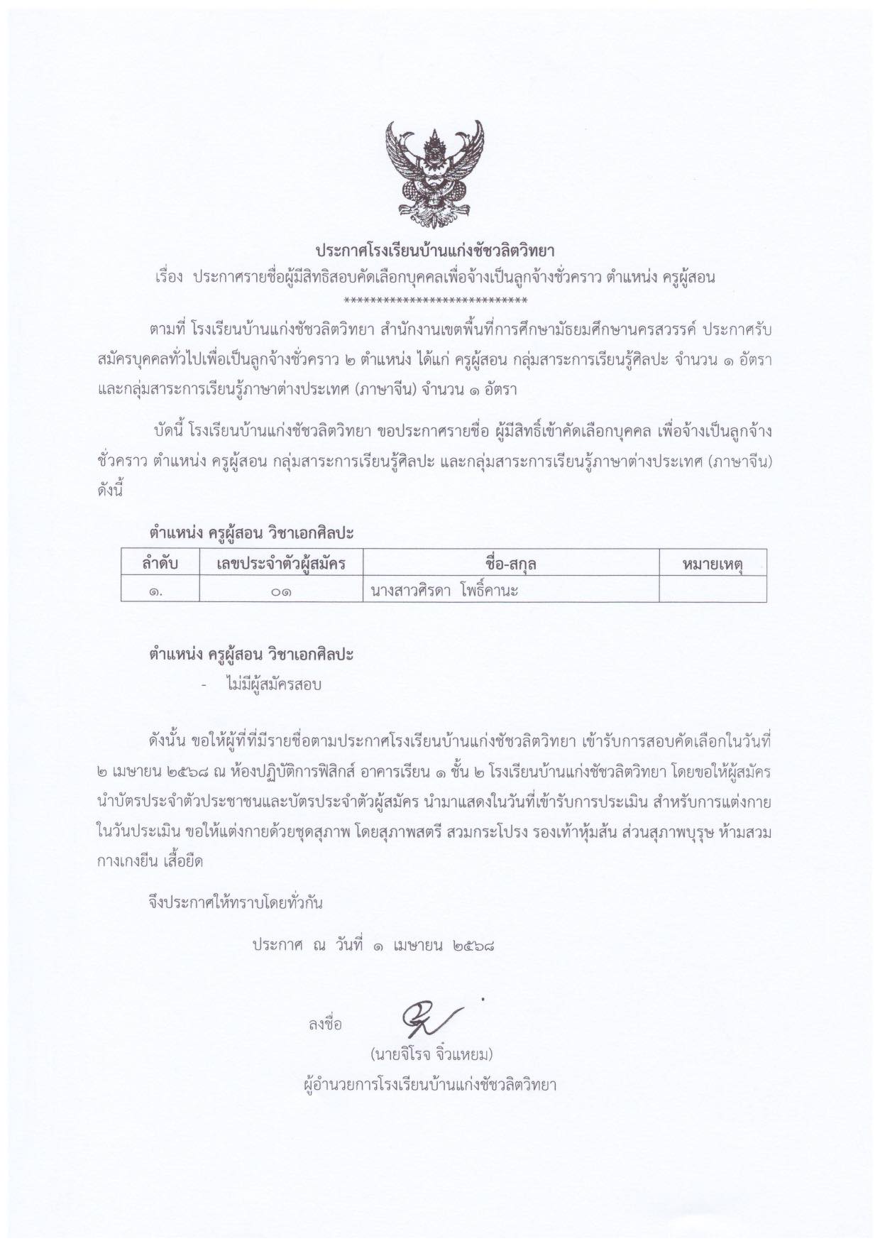 ประกาศรายชื่อผู้มีสิทธิ์สอบคัดเลือกบุคคลเพื่อจ้างเป็นลูกจ้างชั่วคราวตำแหน่งครูผู้สอน ✅ วันสอบคัดเลือก วันที่ 2 เมษายน 2568 เวลา 09.00 น. ณ ห้องปฏิบัติการฟิสิกส์ อาคาร 1 ชั้น 2 โรงเรียนบ้านแก่งชัชวลิตวิทยา