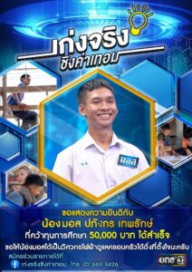 วันที่ 23 ธันวาคม 2567 โรงเรียนบ้านแก่งชัชวลิตวิทยา นำโดย ดร.จิโรจ จิ๋วแหยม ผู้อำนวยการโรงเรียน นางสาววรารัตน์ กันเพ็ชร์ รองผู้อำนวยการโรงเรียน กล่าวแสดงความยินดีกับ น้องมอส นายปภังกร เทพรักษ์ นักเรียนชั้นมัธยมศึกษาปีที่ 6/1 ที่คว้าทุนการศึกษา 50,000 บาทได้สำเร็จ จากรายการเก่งจริงชิงค่าเทอม ช่องone 31 ณ หน้าเสาธงโรงเรียนบ้านแก่งชัชวลิตวิทยา