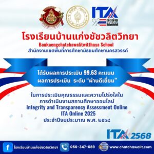 โรงเรียนบ้านแก่งชัชวลิตวิทยา นำโดย ดร.จิโรจ จิ๋วแหยมผู้อำนวยการโรงเรียนฯ นางสาววรารัตน์ กันเพ็ชร์ รองผู้อำนวยการโรงเรียนฯ ขอขอบคุณ ฝ่ายบริหาร และคณะครู ตลอดทั้งผู้ที่มีส่วนเกี่ยวข้อง ที่มีส่วนขับเคลื่อน การดำเนินงานคุณธรรมและความโปร่งใส ประจำปีงบประมาณ พ.ศ. 2568 Integrity and Transparency Assessment Online – ITA Online 2025 ส่งผลให้มีผลการประเมินระดับ “ผ่านดีเยี่ยม” (99.63 คะแนน) ไว้ ณ โอกาสนี้