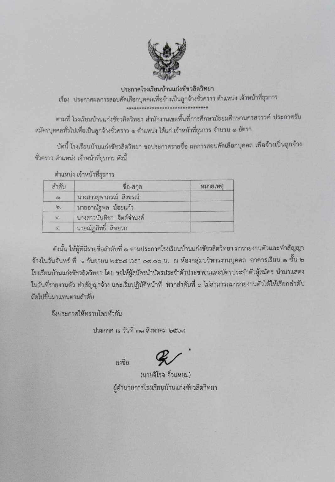 ประกาศผลการสอบคัดเลือกบุคคลเพื่อรับเป็นลูกจ้างชั่วคราว ตำแหน่งเจ้าหน้าที่ธุรการโรงเรียน