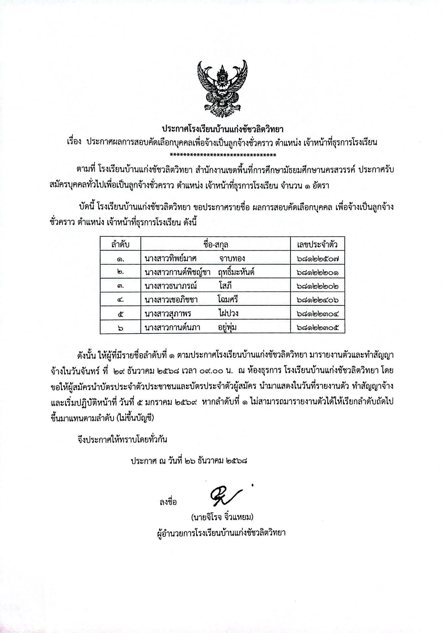ประกาศผลการสอบคัดเลือกบุคคลเพื่อจ้างเป็นลูกจ้างชั่วคราว ตำแหน่งธุรการโรงเรียน